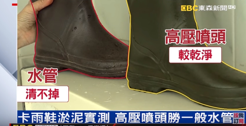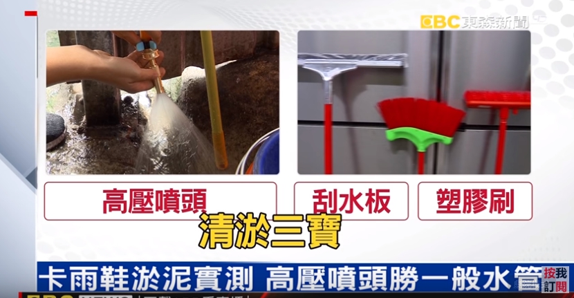 尤其清理淤泥更省力,我們來到823淹水區,卡在鐵板上已經有點硬的泥土,噴一下就掉了,甚至連卡在雨鞋上的泥巴,同樣也能用噴的清掉,一邊是用高壓噴頭沖洗,一邊是用一般水管沖洗,大約30秒後就能看出差別,除了高壓噴頭還有塑膠長刷、刮水板被稱為災後清淤三寶,另外還有這一樣。