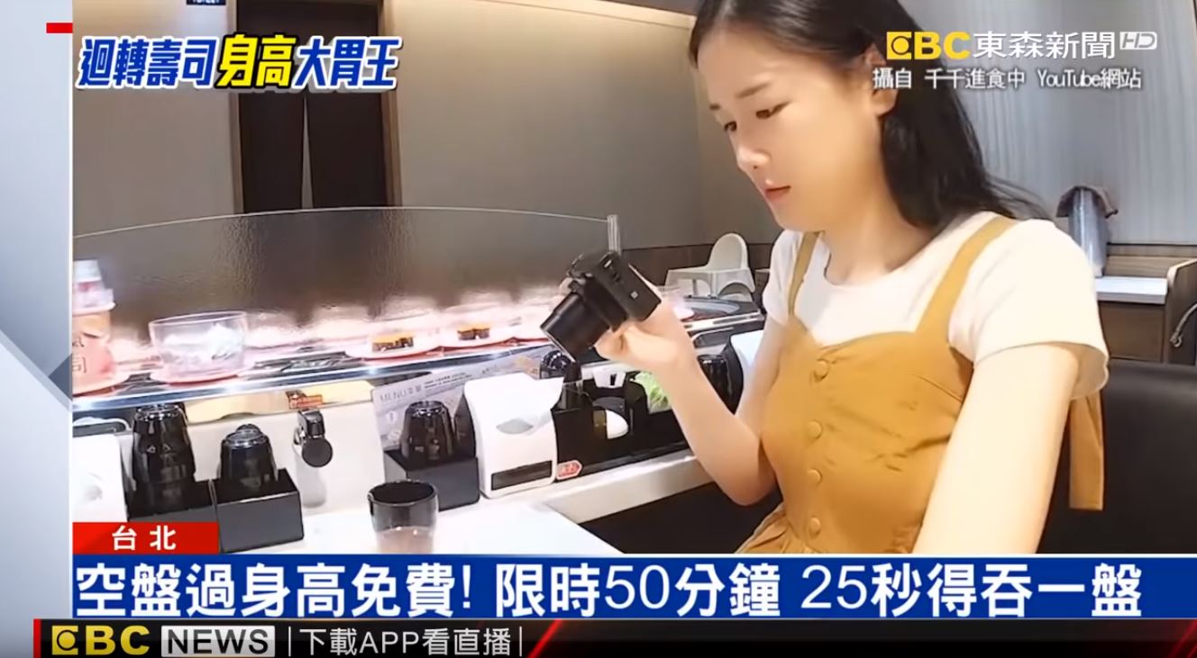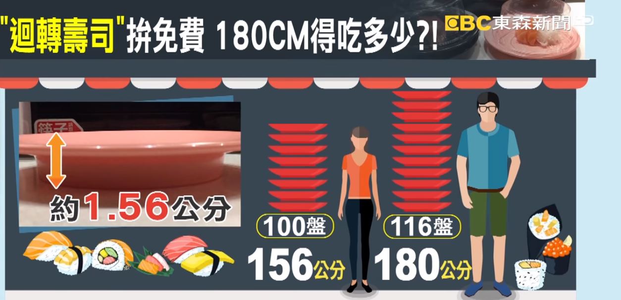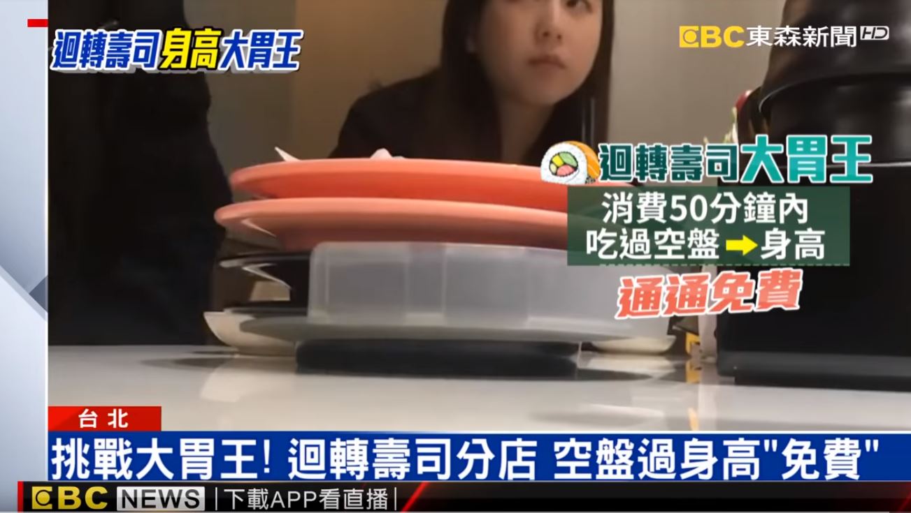 吃迴轉壽司時,您有算過自己可以吃幾盤嗎?有迴轉壽司業者,在特定的分店舉辦挑戰大胃王的活動,只要吃過的空盤疊起來超過自己的身高,就能享免費優惠!換算下來,如果156公分的民眾,就得吃下100盤,而且要在限時50分鐘內吃完。