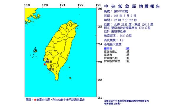 各地最大震度:臺南市地區最大震度2級,高雄市地區最大震度1級,屏東縣地區最大震度1級。