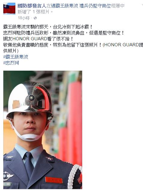 仍要忍受嚴寒站崗。昨(2日)國防部發言人臉書貼出一張照片,照片中可以看到一位駐防禮兵不僅堅守崗位,更因天氣冷到流出鼻血來!事實上這張照片是由網友HONOR GUARD,因為看到他負責盡職的態度,特定拍下這張照片。看到這張照片的網友也紛紛留言「 非常心疼…以你為榮」,「學弟辛苦了!儀隊的精神,堅持到底,永不放棄」稱讚其盡責的態度。