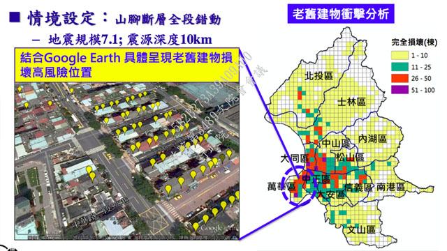 斷層全段錯動且地震規模7.1、震源深度10公里時,以台北市來看,大同、萬華、中正等區域的老舊建築損壞情況可能最為嚴重。