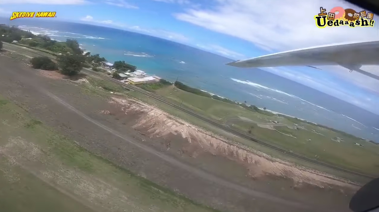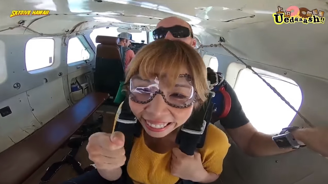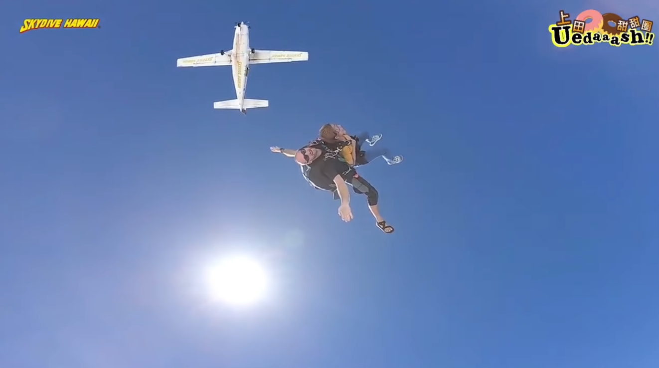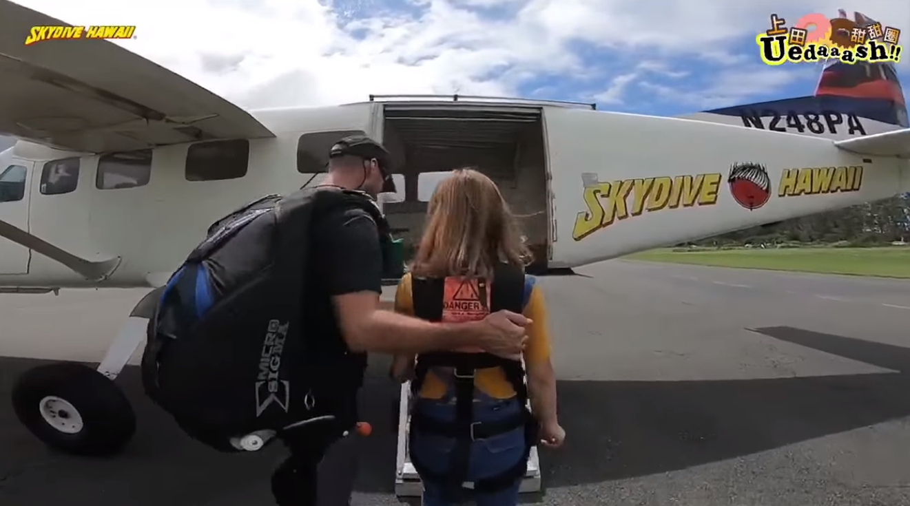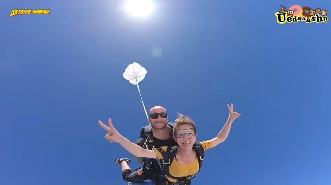 上田太太趁著在夏威夷工作的空檔,決定勇敢地跨出步伐,為了不留下遺憾,完成人生清單之一的瘋狂挑戰「極限跳傘」。上田太太在前往搭機地點時,從她的表情可見內心的掙扎,不斷緊握拳頭,甚至一度慌張到語無倫次。