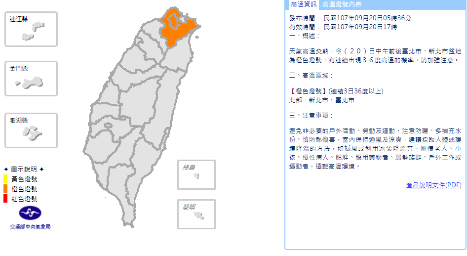 中央氣象局預報員程川芳表示,今(20)日大台北可能出現攝氏36度左右高溫,氣象局也發布高溫資訊橙色燈號,23日起鋒面和東北風報到,中秋節北部低溫探24度。