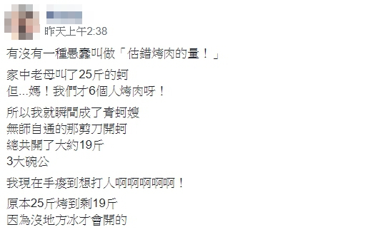 烤肉,但一名女網友23日在臉書發文,透露家中只有6人烤肉,媽媽卻叫了25斤(約12.5公斤)的蚵,根本烤不完,最後只好自己拿剪刀開蚵,當起青蚵嫂,她崩潰地說,「有沒有一種愚蠢叫做『估錯烤肉的量!』」而其他網友看了也都笑翻狂歪樓,「可想而知,媽有多想