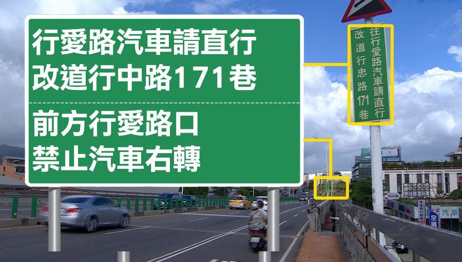 很多人不曉得,也難怪車子一輛接著一輛右轉,不知不覺中就違規了,其實橋上有立牌告訴你,往行愛路汽車請直行,改道行中路171巷,以及前方行愛路口禁止汽車右轉,但是橋上7個立牌,不仔細看很難發現。