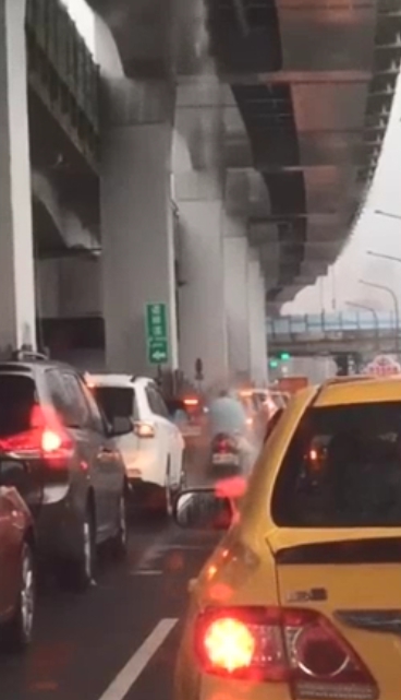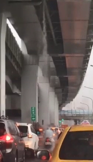 一名網友在臉書「爆廢公社」分享一段影片,從畫面中可見,當時外頭正下著滂沱大雨,許多汽機車都在高架橋下停等紅綠燈,剛好可以躲避大雨的襲擊,不過其中一名身穿藍色雨衣的騎士,卻剛好停在「瀑布」落下的地方。