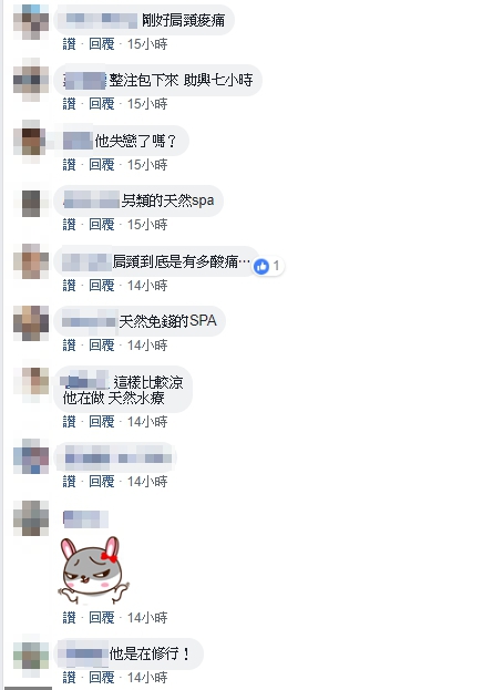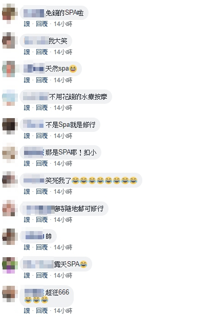 影片曝光後笑翻一票網友,紛紛笑虧:「打通任督二脈」、「免費的SPA」、「這是水療法」、「剛好肩頸痠痛」、「高手修行不是都這樣嗎」、「回去會發現通體順暢」、「平凡人無法體會的」、「天將降大任於斯人也,必先苦其心志,勞其筋骨」。