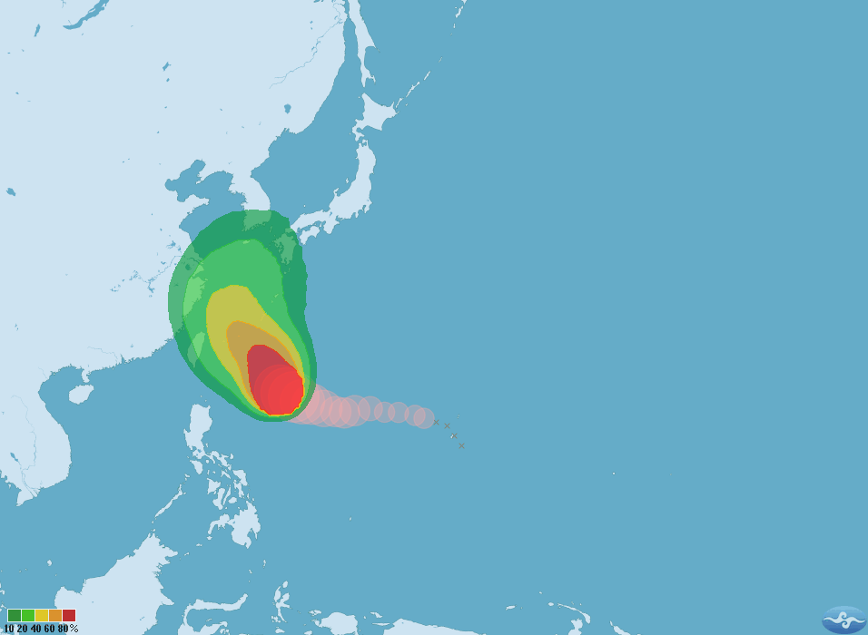 第24號強烈颱風「潭美」今天凌晨2時位於鵝鑾鼻東南東方910公里的海面上,目前各國模式模擬認為,強颱潭美未來路徑將朝台灣東部海域北上,直接侵台機率降低,但28、29日最接近台灣,外圍環流仍會帶來降雨,30日之後颱風將遠離台灣附近往日本移動。