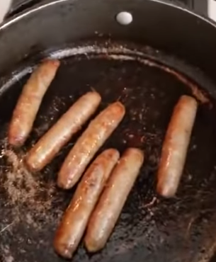 香腸放平底鍋要準備煎熟,豈料翻炒過程,香腸竟發出宛如牲畜被屠殺的淒