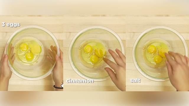 1. 拿出一個大碗將三顆雞蛋打入,灑上少許肉桂粉和鹽,並均勻打散。