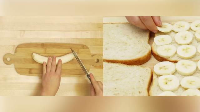 2. 將香蕉切成薄片,平均鋪在兩片吐司上。