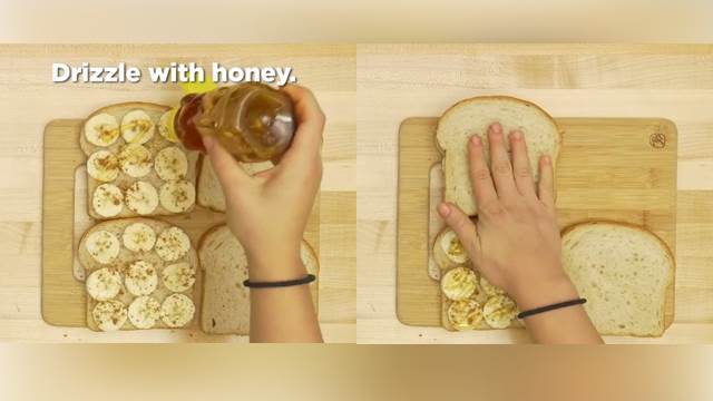 3. 灑上些許肉桂粉,並淋上一些蜂蜜,再把一片乾淨吐司蓋上。