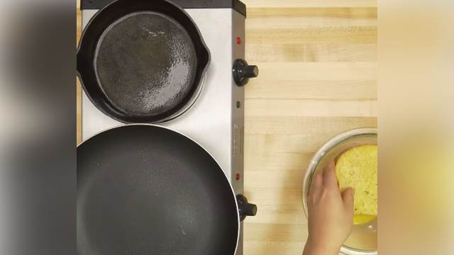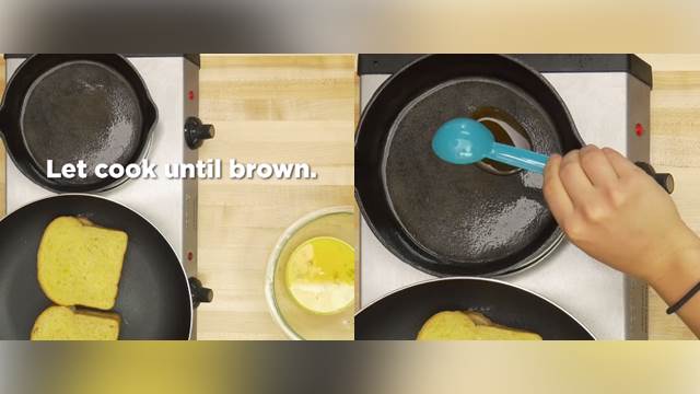 5. 用平底鍋煎剛剛用好的吐司,兩面要平均煎到金黃色,並同時用另一個平底鍋加熱三匙的楓糖漿。