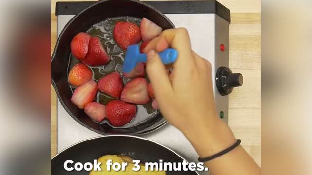 6. 把對半切的草莓放進加熱後的楓糖漿,煮三分鐘。