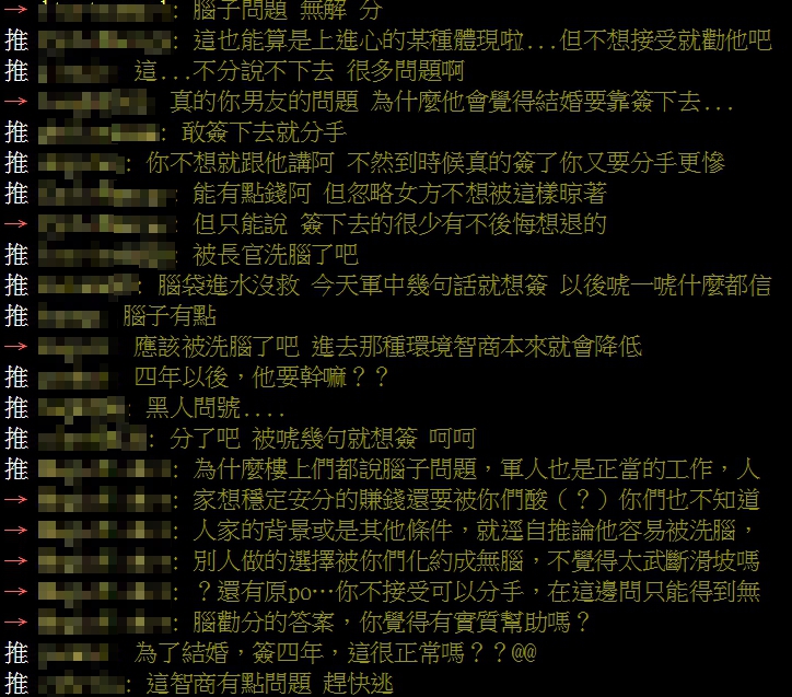 網友看完則紛紛留言「真的你男友的問題 ,為什麼他會覺得結婚要靠簽下去」、「應該被洗腦了吧」、「只能說,簽下去的很少有不後悔想退的」、「為了結婚,簽4年,這很正常嗎?」、「這也能算是上進心的某種體現啦,但不想接受就勸他吧」、「這是他原本就有考慮的規劃嗎?不然我覺得是一時被唬了」、「妳男友腦波可能很弱,妳考慮一下」、「沒討論、沒共識,女生都覺得結婚還太遠。為了結婚而簽,可是要是走不到四年後呢?」