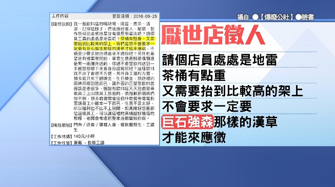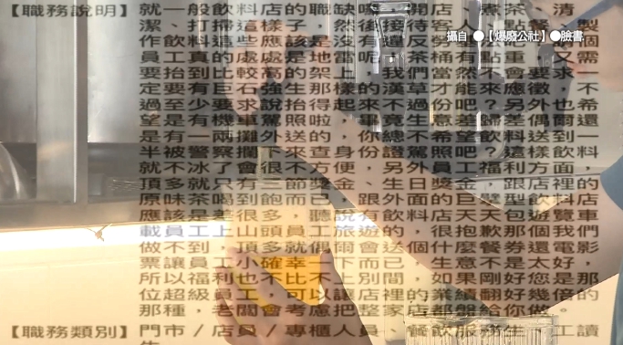 一名女網友在《爆廢公社》發文,她PO出一張人力銀行的截圖表示:「這老闆好像很厭世…」,從職缺說明可以得知是飲料店的徵人啟事,內容寫道:「就一般飲料飲料店的職缺囉,開店、煮茶、清潔、打掃這樣子,然後接待客人、點餐、製作飲料這些應該是沒有違反勞基法吧?請個員工真的處處是地雷呢!」