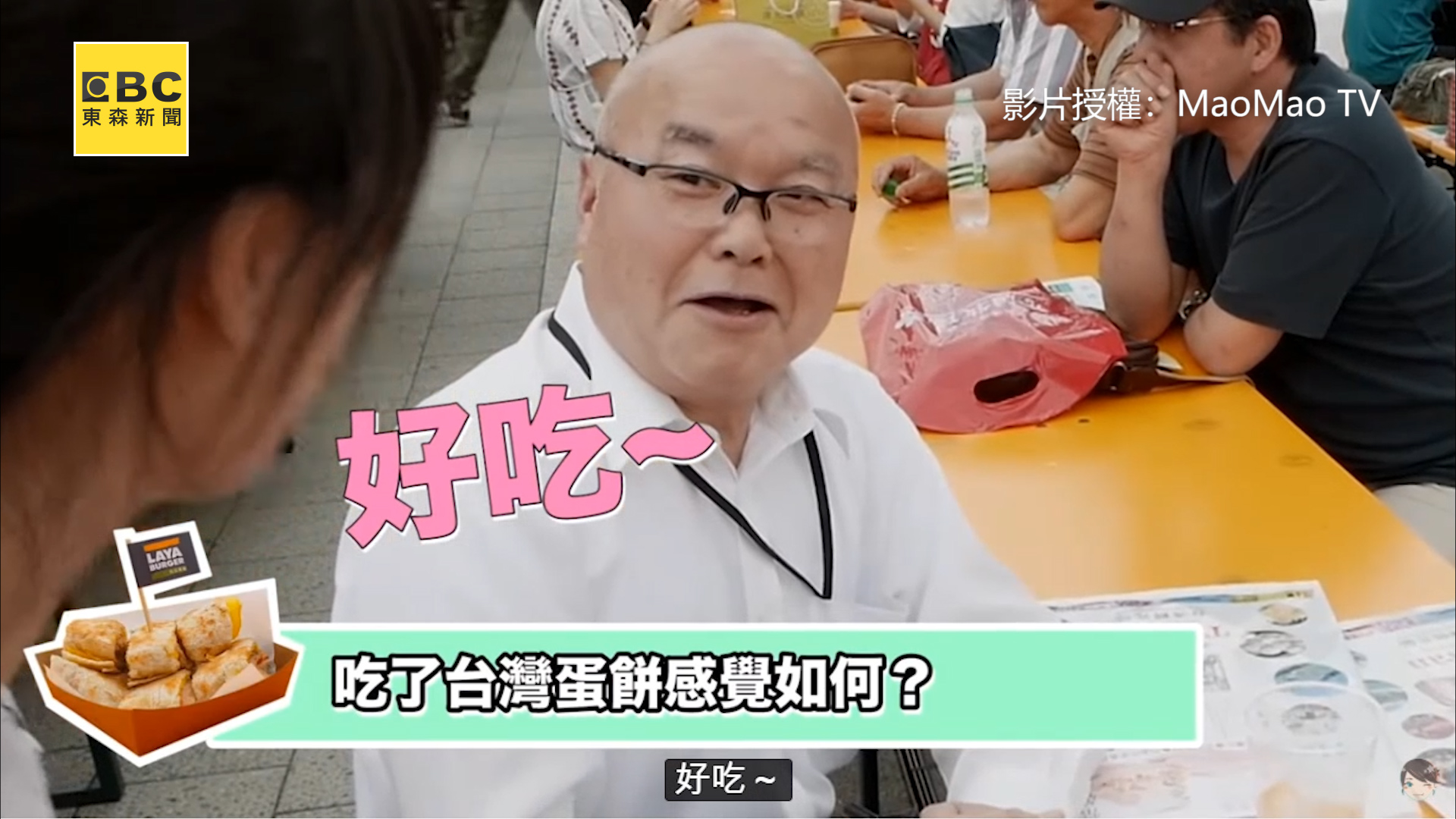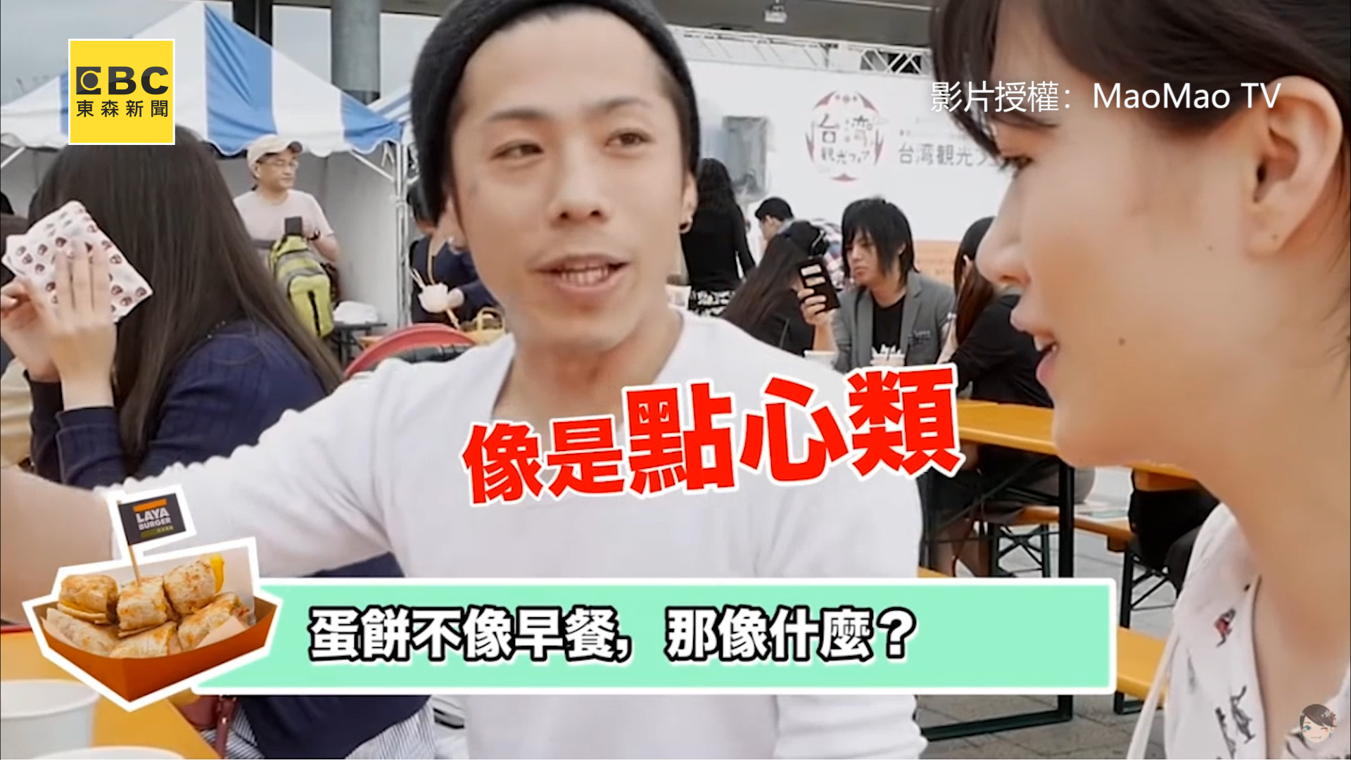 Mao訪問了現場正在享用蛋餅的日本人,沒想到竟一致獲得好評,酥脆的餅皮及和超豐富的內餡完全擄獲了日本人的胃。日本傳統早餐是白飯和味噌湯,蛋餅對他們來說反而比較像是點心,也有人認為吃起來鹹香的蛋餅很適合當
