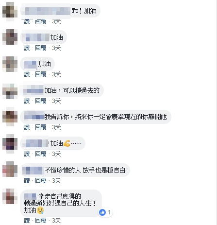 婚姻把自己束縛在家」、「這種男人放生吧」、「不要害怕明日的到來,後面還有更美的風景」。