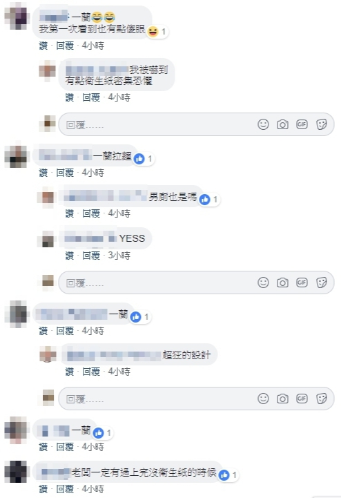 網友們留言笑說:「我第一次看到也有點傻」、「一輩子都不想聽到客人說廁所沒衛生紙!」、「是讓小朋友玩到開心的感覺......」、「怕客人要上廁所時沒衛生紙造成困擾,所以設計備用的衛生紙,但只有一個還是不安心,所以2個,還是不安心所以3個…然後一發不可收拾越來越多」。