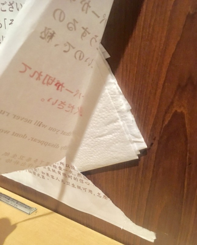 事實上,一蘭的貼心不只如此,就連告示單後面都藏有玄機,譯名日本網友在一蘭上廁所時,剛好遇到衛生紙用光的尷尬窘境,她看見眼前的牆面貼了一張告示單,「有鑑於本社代表常提出『萬一客人沒衛生紙用時怎麼辦?』,因此為此特地準備了『秘密兵器』」,沒想到撕下告示單,後面竟還藏了一小疊衛生紙!