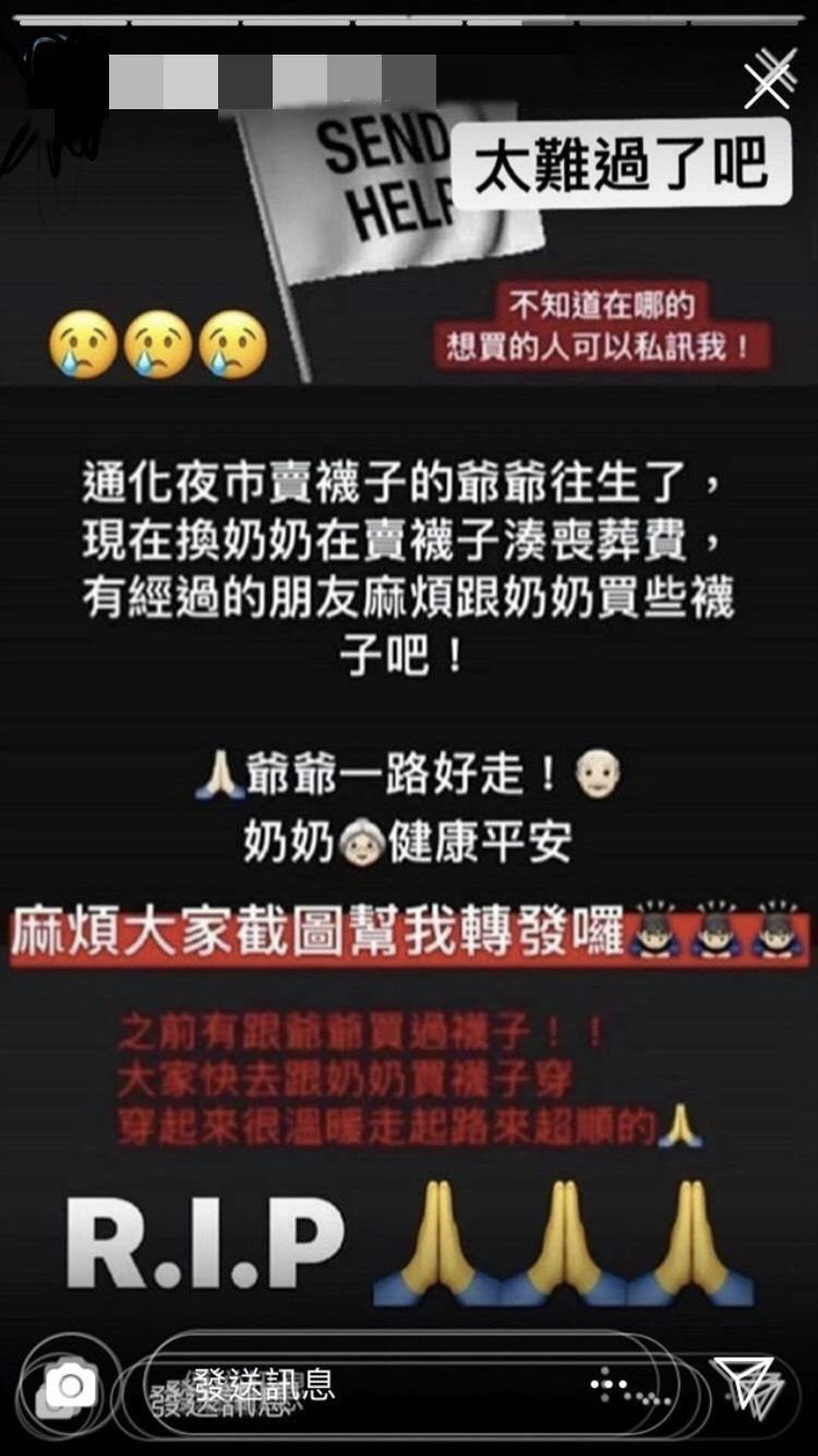 沒想到,有網友發現襪子爺爺離世了,現在換奶奶在賣襪子湊喪葬費」,內容表示,「不知道各位知不知道這位爺爺,每次去通化都會跟爺爺買襪子,後來好一段時間都沒再看到他了。他的襪子真的很好穿!現在換奶奶在賣了,有經過的人希望可以幫忙一下」。