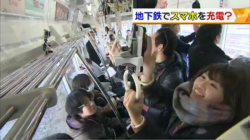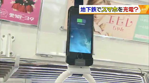 這樣的痛苦,名古屋地鐵聽到了!根據雜誌《3C新報》報導,名古屋市營地下鐵車廂內,最近加入一項「手機充電」新服務,讓民眾進了車廂,坐到哪就充電充到哪,而且「不用搶插座」!這個發明是一位日本大學生想出來的,他將充電器和車廂內的「扶手吊環」結合,只要將手機插上去就能即時充電。
