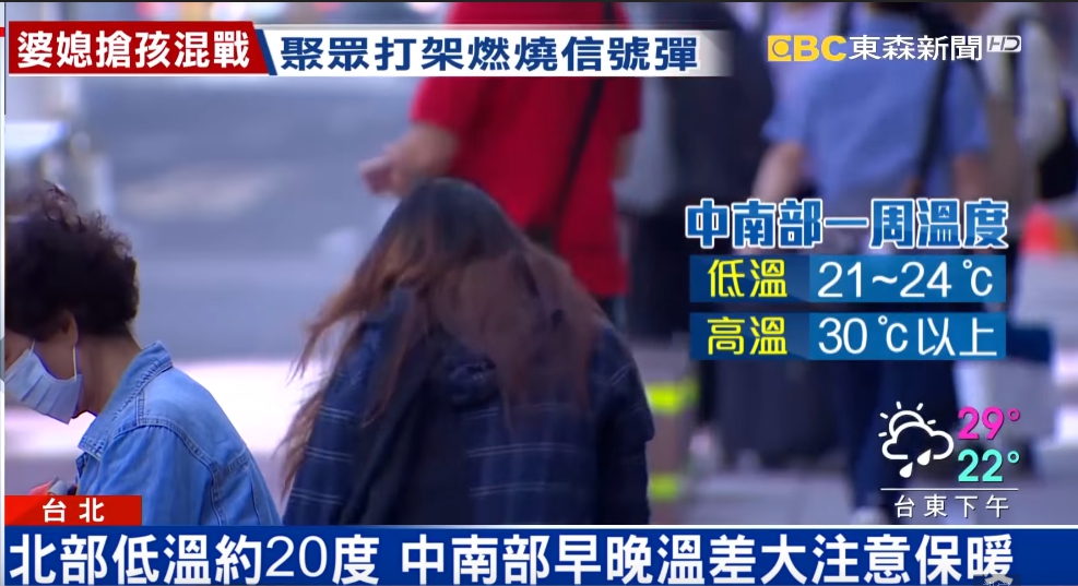 在溫度方面,相較於昨天北部高溫達28℃,今天估預測新竹以北及宜蘭地區最高溫為22、23℃,相差5℃,中部及花、東高溫約26至28℃,南部地區白天甚至可達30℃左右,各地早晚都較涼,約19至23℃,提醒民眾出門記得多帶件外套,以免著涼。