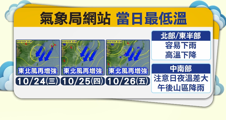 東北季風減弱,周末天氣放晴,水氣也跟著趨緩,不過清晨,北部沿海空曠地區,低溫還是維持在19到20度之間,白天高溫則是可以回升到27度,中南部甚至上看30度,好天氣預計可以維持到下周二23號。只是從24號開始,一連三天東北風又會再度增強,北部東半部地區容易下雨,白天高溫也會下滑,中南部地區影響相對小,不過要注意日夜溫差大,午後在山區也不排除,有對流發展造成降雨。氣象局預報員李孟軒:「不過下一波的東北風,目前看起來強度不會很強,所以溫度方面的話,應該不至於有太大的變化,比較遙遠的一個海面上,可能會有颱風形成,不過因為在還沒形成之前,它的變數會比較大一點。」
