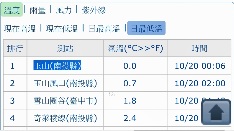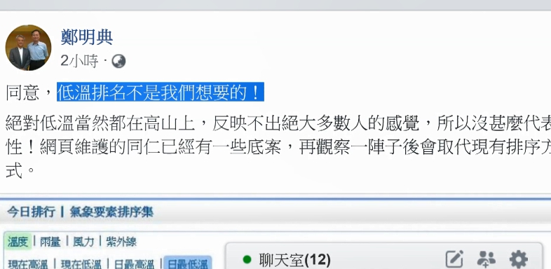 天氣一天比一天涼,尤其越來越接近冬天,清晨夜晚低溫也持續下滑,不過現在氣象局的網站「每天全台的最低溫度」,卻在上一次改版中,把「高山」的低溫也納入排行,造成前幾名都是高山的0度上下。現在氣象局副局長鄭明典也在臉書說,未來將會有新的方案,考慮把平地跟高山分類。