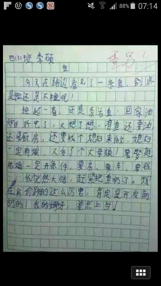 卻從「在路邊看見一條魚,到底是撿還是不撿呢」,延伸到娶妻生子、丈母娘開條件、房價大跌...。最後文章總結竟是「這條魚是建商扔的」!心思縝密的因果串連,讓網友大讚真是「神腦補」的文章、「深謀遠慮,刻畫人生寫實的作品...」,也惹得老師在右上方簡潔的兩字評點