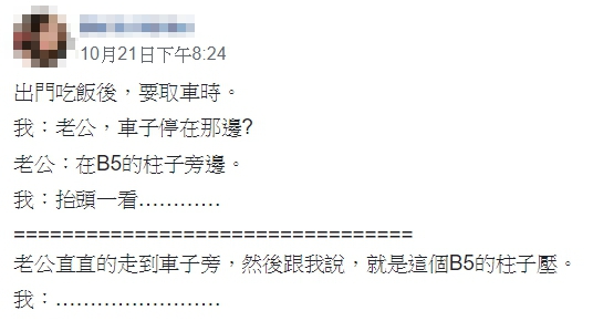 原PO在臉書《爆廢公社》貼出照片,表示和老公到三創逛街吃飯,吃飽喝足後到停車場準備取車回家,她隨口問了一句「老公,車子停在哪邊?」對方則迅速回應「在B5的柱子旁邊」,看似給了一個相當明確的方向,不過原PO一抬起頭準備找車時,看到停車場的景象後瞬間傻了。