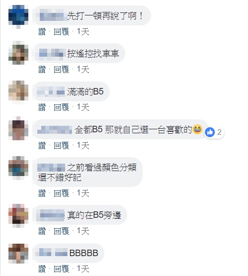 網友看到照片全都笑瘋,紛紛留言猛虧「你們家車真多」、「真的在B5旁邊啊」、「先打一頓再說了啊」、「他的意思是,這裡的車都是妳的」、「原來這層是你家的停車場」、「往好處想至少知道在哪一層樓」、「你不懂他的明白」、「原來是炫富文啊!我還以為是車子找不到呢」、「意思就是,全部都是老公的車」,還有人建議「下次記得拍照」、「記地上的格子比較準」、「邊走邊按遙控器吧」。