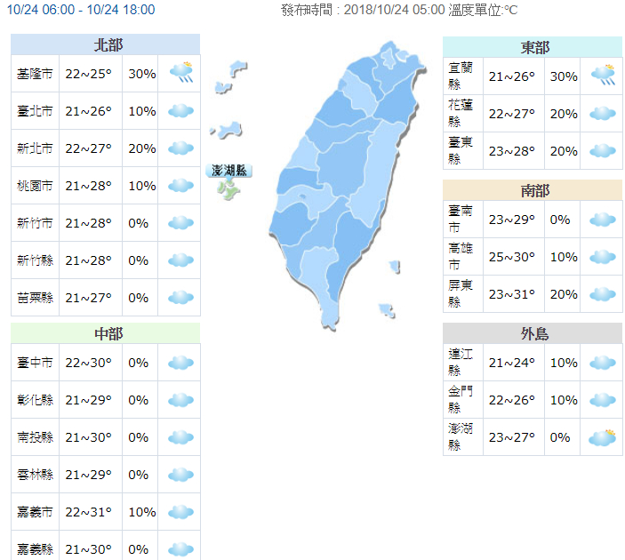 受東北風影響,今(24)日清晨北部及東半部雲量多,北海岸、北部山區及東半部有零星降雨,基隆北海岸及宜蘭降雨機率稍高,至於中南部仍維持多雲到晴的天氣型態,午後山區有局部短暫陣雨。清晨較有涼意,各地低溫則約21至23度,中南部日夜溫差較大,早出晚歸請留意氣溫變化。