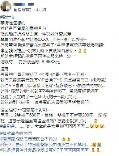 一名男網友在臉書「爆廢公社」發文,他表示日前趁著週年慶到百貨公司購物,原本只想買一件單價5千多元的羽絨衣,就在準備結帳時,店員出現了,開始用各種優惠誘惑要原Po湊滿額,拿回饋跟禮品,「說的此時不買後悔終身似的」。原Po不到一會兒便動搖了,他又挑選了2件衣服來湊滿額贈,豈料,結帳時,打折後的金額居然是9千6百多元。