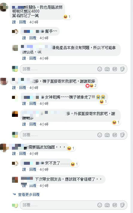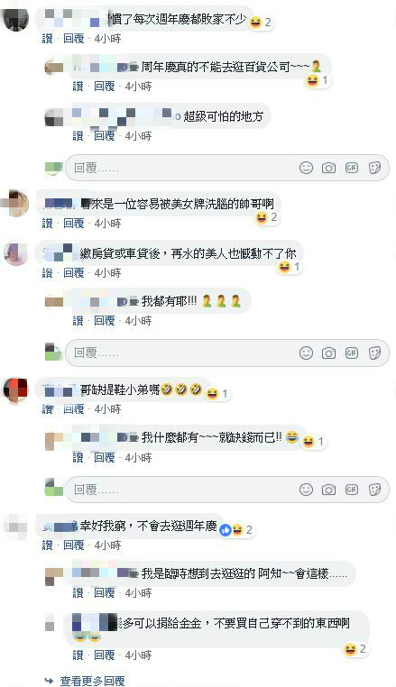 貼文發布後引起許多網友共鳴,紛紛留言「就跟我前年莫名奇妙在某櫃花了5萬一樣可怕」、「腦波弱的容易成為VIP,外套每個顏色都買齊了」、「習慣了每次週年慶都敗家不少」、「沒關係,我也是腦波弱,明明只想花4千8莫名的花了一萬」、「你需要腦波加強器」、「去專櫃都要把耳洞閉起來」,還有人笑虧「帥哥這詞真好用」。