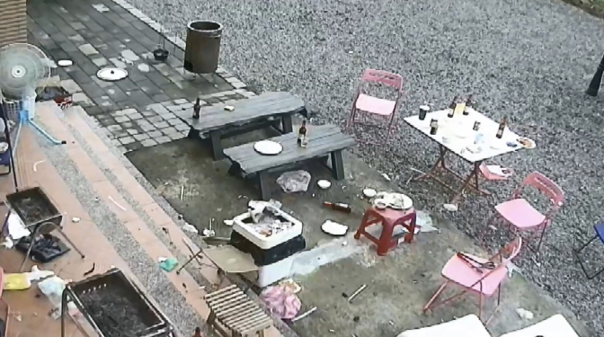 一進門,白色的餐桌上,瓶瓶罐罐擺得到處都是,吃過的食物全都還在桌子上,走到庭院一看,前一晚烤肉,烤肉架和食物都還在原地,整個現場宛如被垃圾轟炸,民宿管家一早進門完全被嚇呆。