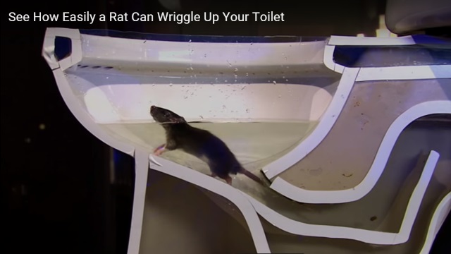《國家地理頻道》的實驗,把馬桶切成一半,從側面圖掌握老鼠的動態。結果發現老鼠經由下水道進入住家馬桶排水管,最後游進你家,過程中,老鼠不僅輕鬆穿越蓄水區,而且牠的身體相當有伸縮性,只要頭能穿過的小洞,身體就一定過得去,所謂的「頭過身就過」,用在鼠輩們身上真是分毫不差呀。