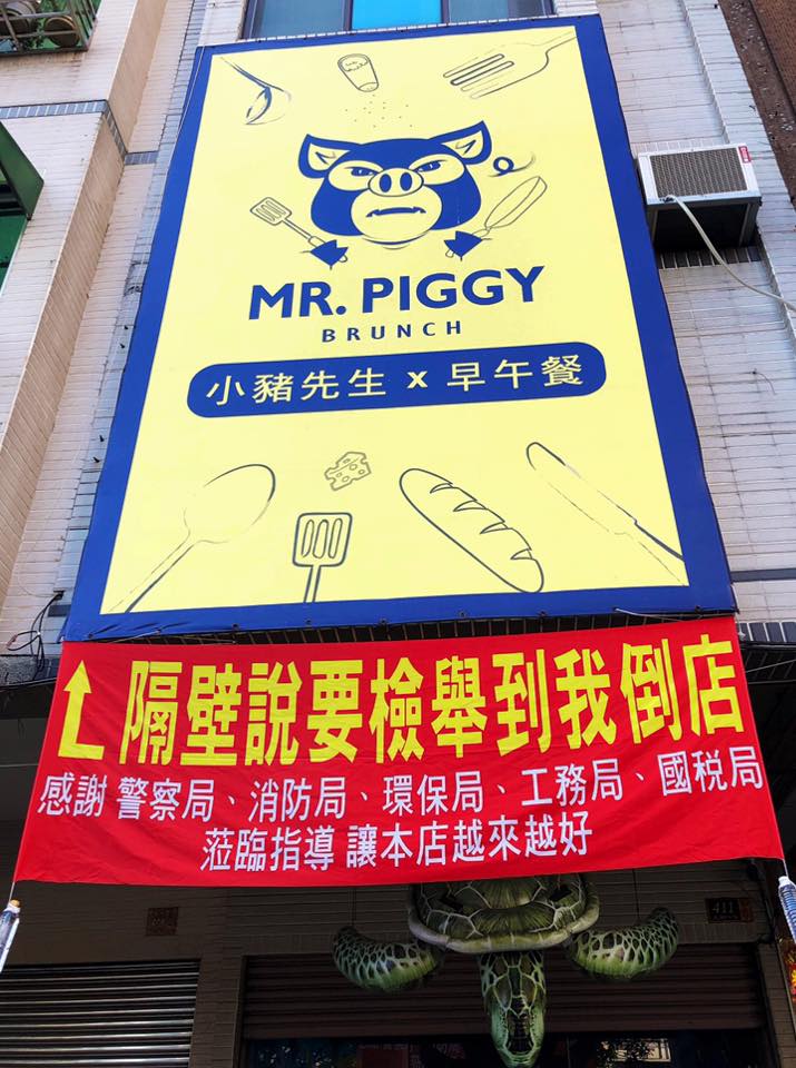 這間「小豬先生×早午餐」昨(3日)在臉書粉專上PO出店門口的照片,只見紅布條上寫著大大的「隔壁說要檢舉到我倒店」,下面更寫:「感謝警察局、消防局、環保局、工務局、國稅局蒞臨指導,讓本店越來越好」,超狂的「5局認證」引起網友熱議,紛紛表示想了解事情始末,老闆對此也做出了回應。