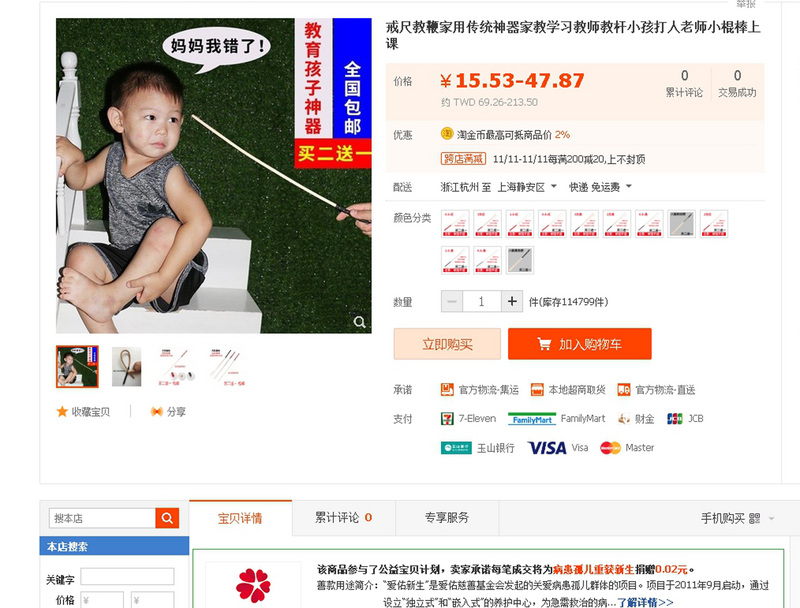 雙11「買買買」進入高潮,但若將「打小孩」視為一門商機,將涉及侵犯孩童權益。淘寶網近來出現大量教鞭、藤條的販售,並以「媽媽我錯了」為廣告詞,還標榜打人小棍棒「買二送一」。