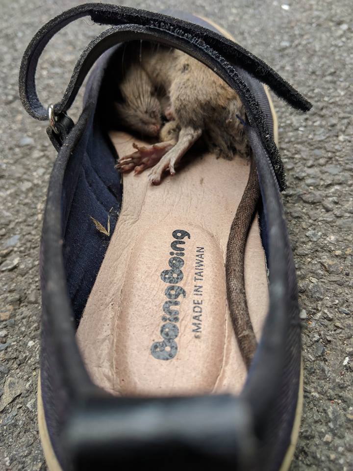 一名網友在臉書社團《爆廢公社》上分享一張照片,並在這篇貼文寫道:「老婆以為是襪子,還在沒穿襪子的情況下,用腳趾捅了米奇30秒…。」而照片中只見一隻老鼠躺在涼鞋裡,已經不會動了,看似已經斷氣,原Po更逗趣幫米奇配上os:「米奇:是沒看過有人卡在鞋子裡?就卡住了!幫幫忙好嗎?」