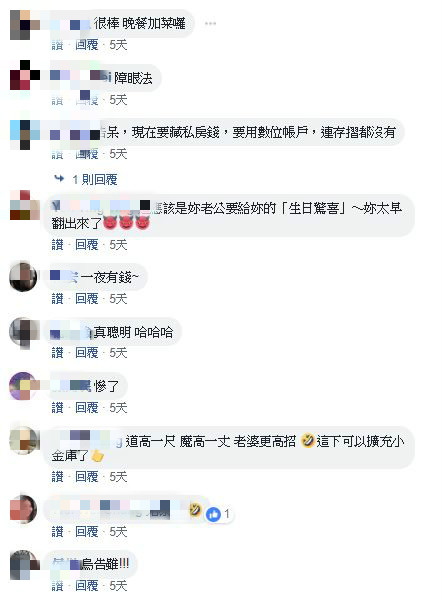 貼文曝光後,引起熱烈討論,也讓不少網友笑翻,「1111購物節來得真是時候」、「好一個最危險的地方就是最安全的地方」、「意外就這樣發生了」、「聲東擊西的概念」、「零錢用來分散注意力的」、「老公GG」、「好慘,瞬間噴20萬」、「誰找到就是誰的」、「硬幣只是障眼法」、「道高一尺,魔高一丈,老婆更高招」,還有人不忘打趣提醒原Po,「這2本給妳過過癮,硬幣下說不定還有好幾本!記得翻一下」。