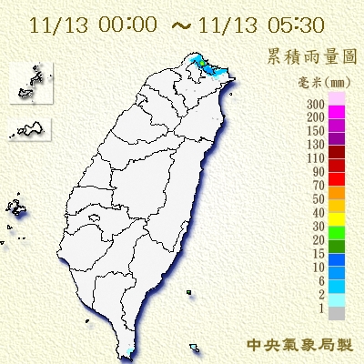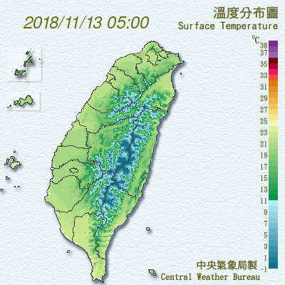 中央氣象局表示,今、明(13日、14日)兩天東北季風影響,北部及東北部天氣較涼,中南部早晚亦涼,今日臺灣東北部地區及北部山區為有雨的天氣,並有局部較大雨勢,北部、東部、東南部及馬祖地區亦有局部短暫雨,其他地區及澎湖、金門為多雲到晴的天氣。