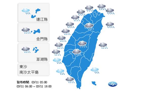今天仍受華南雲雨區東移影響,各地氣溫較低,全臺普遍有雨,尤其中部以北及宜蘭地區、南部及花東山區降雨明顯,其他地區及澎湖、金門、馬祖亦有短暫雨。氣象局針對部分縣市發布大雨特報,白天起雨勢將減小一些,但各地降雨機率還是偏高;溫度部分由於冷空氣持續影響,且中部以北及東北部降雨時間長,北臺灣高溫僅約14度,中部約16度,一整天感受比較