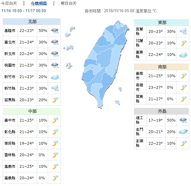 北部及東半部高溫約26、27度,中南部高溫約30度左右,各地清晨及夜晚低溫普遍在21至23度之間,中南部日夜溫差較大,請留意溫度的變化適時調整穿著,注意保暖。這波鋒面預計持續至下周四(22日)。