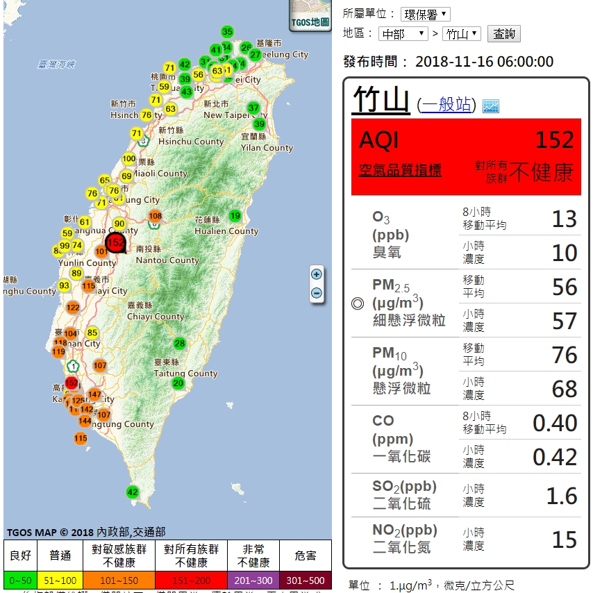 而根據政院環保署空氣品質預報資訊,今日宜蘭及花東空品區為「良好」等級,北部、竹苗空品區為「普通」等級,中部以南位在下風處,擴散條件差,中部、雲嘉南以及高屏空品區為「橘色提醒」等級。