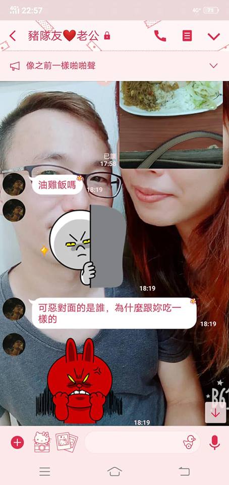 原PO在臉書《爆廢公社二館》發文,可以看到她和老公透過LINE對話,她傳晚餐的照片給老公,老公先是問:「油雞飯嗎?」接著暴怒表示:「可惡對面的是誰,為什麼跟妳吃一樣的?」還附上一個生氣的貼圖。另一張照片可見,她的便當菜色,不過對面竟也有一盤相同的東西,仔細一看,原來是鏡子反射的倒影,這也讓原PO無奈:「請問我老公眼睛是不是有問題?」