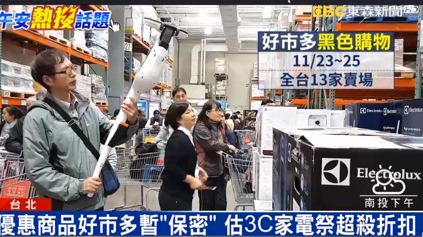 今年當然也不例外,美式賣場好事多再推黑色購物節,23日周五起一連3天,在全台13家賣場同步開跑,哪些優惠商品依舊保密到家不會提前公開,去年活動包括60吋電視送45吋電視售價3萬多,另外一些生活用品和家電等也下殺6.1折起預期今年差不多,也會有高單價的3C家電推出折扣,但其他量販店和超市,也不甘示弱。