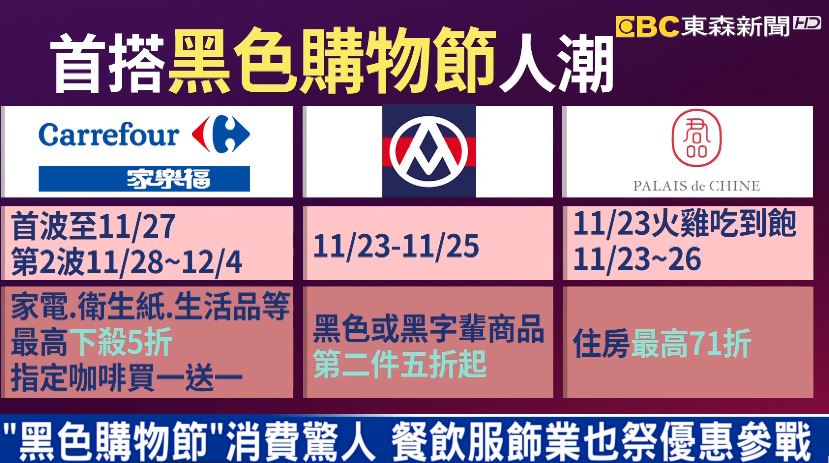 家樂福也將推出2波黑色購物節活動,主打會員專屬,不但家電、衛生紙和生活用品等有優惠,還有滿888元加價購,最高下殺5折,同步推出指定咖啡品牌,祭出買一送一優惠,除此之外,像是超市全聯限期3天,黑色或黑字輩的商品,第二件五折起,連餐飲業也有,君品酒店今年也首度舉辦「黑色星期五驚喜優惠」將推出火雞吃到飽,以及住房下殺71折優惠。