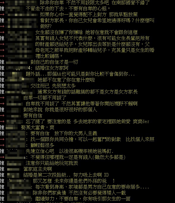 原PO因為自認家境普通,不是醫師、牙醫或台積電等年收幾百萬,「可能給不起人家爸爸給她女兒的生活」,雖然對方觀念是「AA制(各付各的)」,但他仍擔心2人家境有落差,「就有點不敢繼續曖昧了」,希望鄉民能夠給他經驗分享,但不少鄉民看完後,都一面倒推文表示,「除非你自卑,不然不用設限太多吧!在南部國營不錯了」、「不管走不走的下去,不要有自卑的心態」、「如果你心中一直覺得配不上對方,那就早點放棄」、「自卑一切都不用談了」、「自卑就不用談了」。