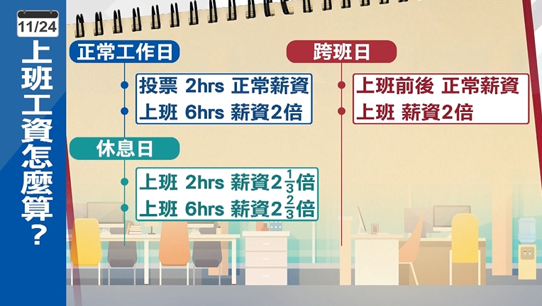 今天(24日)是投票日,有投票權的勞工應該放假一天,如果必須上班,工資該如何計算呢?勞動部將公布三種方案,如果是原本就上班的勞工,兩小時正常薪資,六小時領兩倍薪資;如果是跨班,投票日當天的薪資也可以拿兩倍;至於休息日加班的勞工,可以領最多,詳細算法來看我們的報導。